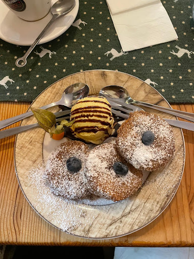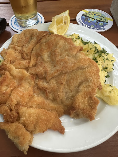 We found this place by searching for somewhere local and traditional when we were staying at the Novotel Messe, and we came upon this absolute gem. Unfortunately no menu in English, but that’s okay, that’s why we have Google Translate on our phones. The food is outstandingly delicious, freshly made at this family restaurant, you could not fault it, and portions are incredibly generous. My wife and I went for different versions of regional favourite, Schnitzel, and we weren’t disappointed, flavoursome and not at all greasy. Our daughter went with the crispy chicken burger, and that too was freshly prepared and nicely presented. So generous were the portions that we elected to share 2 desserts between the three of us - a wise choice. Again, freshly made and, as fabulous as the molten chocolate cake was, the apple fritters were off the charts fantastic. Drinks were as you’d expect, with the local brew beer being especially welcome on a balmy summer evening on the terrace. It was wonderful to see the place busy with locals (and very well behaved dogs), enjoying great food and the social atmosphere. As the food is freshly prepared please be prepared to wait, it’s worth it, and relax with...
