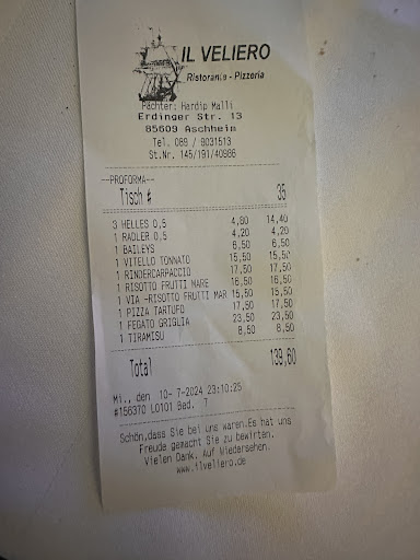 Im Rahmen des 1. NFL Footballspiel 🏈 auf deutschem Boden in München, führte uns unserer Weg nach Ascheim! Nach über 4h Anreise waren wir hungrig und durstig! Auf der Suche nach einer schönen gastronomischen Location standen wir vor dem italienischen Restaurant II Veliero Pizzeria! Es war 17:30 Uhr, und es war schon offen, obwohl 18:00 Uhr offiziell Start sein sollte! Das Restaurant war bis auf zwei Personen komplett leer, allerdings waren alle Tische mit einem Reservation versehen! Wir fragten trotzdem nach einem Tisch, und bekamen sofort einen schönen zwei Mann Tisch. Wir freuten uns sehr, und der Service kümmert sich sofort hervorragend um uns. Die Vorspeise, der Hauptgang, die Getränke und das gesamte Ambiente haben uns restlos begeistert! Am Anfang haben wir gedacht, wie kann es sein, dass am Samstagabend um 17:30 Uhr alle Tische reserviert sind? Aber wir merken schnell, dass dieses hervorragende italienische Restaurant gegen 19:00 Uhr bis auf den letzten Platz belegt war! Der Grund ist einfach: Herzlichkeit, Wertschätzung, top Service, edle Speisen, hervorragendes Ambiente und eine Gastfreundschaft, wie man sie selten erlebt! Es war ein wunderschöner Abend für uns und wir gingen glücklich in unser Hotel. Am nächsten Tag, nach dem tollen Football Event in der Allianz Arena 🏟️ in München führte uns unser Weg abermals in diesen Tempel des Genusses! Wir hatten nicht vorbestellt 🫣! Trotzdem wurde für uns, obwohl das Restaurant wieder proppevoll war, ohne wenn und aber ein Tisch gezaubert! 🎖️