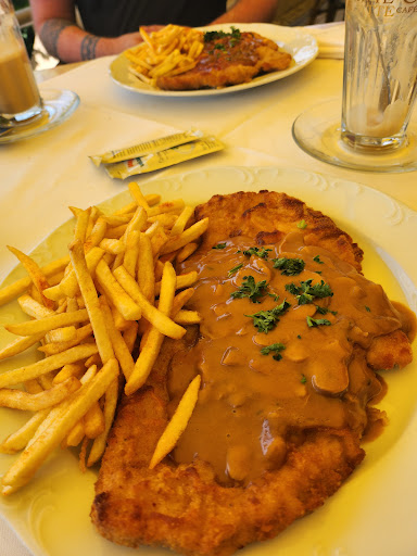 Das Essen, das wir bekommen haben, war auch nur mäßig. Auf dem Flammkuchen war der Belag noch recht weit vom Rand entfernt. Der Fleischkäse war fast verbrannt, das Spiegelei darauf ebenso. Unser Begleiter hat es tapfer gegessen. Der Hunger treibt‘s rein.