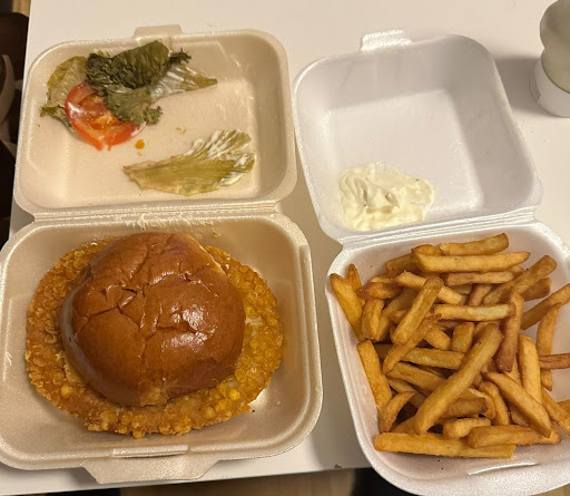 Nach 2,5 Stunden Wartezeit kamen unsere Burger und Pommes kalt an. Der Burger, den wir bestellt hatten war der Classic Crunchy Chicken Burger und dazu Pommes. Die Pommes waren wie Pappe und der Burger selbst bestand aus einen Tiefkühl Patty, darunter lagen 3 Scheiben Salat der sehr weit entfernt von "frisch" war und eine matschige Tomaten Scheibe. Diesen Laden kann ich leider...