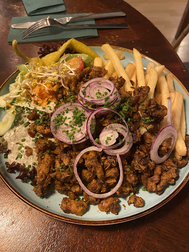 Wir waren zu dritt da. Wir hatten zweimal das Gyros aus Kichererbsen-Protein mit Tzatziki, Salat und Süßkartoffelpommes. Und meine Schwester hatte die veganen Rindsouladen mit Rotkohl, Soße und Knödel. Und als Vorspeise hatten wir einmal einen frittierten Blumenkohl mit Barbecue-Dip und einmal Mozzarella-Sticks und einmal chili cheese Nuggets. Natürlich alles vegan und es war einfach unglaublich lecker. Ich habe noch nie ein veganes Käseprodukt gegessen, das so lecker war wie im Dill-Restaurant. Es war total super lecker. Auch das Gyros aus Kichererbsen-Protein war sehr schmackhaft. Es hat wirklich sehr lecker und hat würzig nach Gyros-Fleisch geschmeckt. Es war einfach unglaublich gut. Es war so ein tolles, leckeres Essen und wir sind alle pappsatt geworden. Zu trinken gab es Eis-Tea für uns, Radler und einen Aperol Spritz. Und der Eis-Tea war super lecker. Bei den Zutaten hat man einfach rausgeschmeckt und generell, dass das wirklich frisch ist. Frisch gemachter Salat war knackig und es war so lecker, dass Tzatziki was dabei war, genauso. Beim Gyros war es auch lecker. Es war wirklich ein Fest gewesen. Sehr deliziöses Essen. Und die Bedienungen waren sehr süsse Mäuse. Also ganz, ganz liebes Personal auch.
