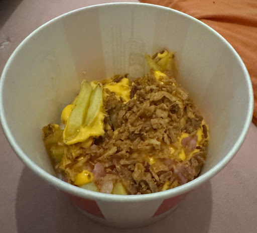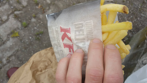 Da ein Freund hier eine Wegspeise mitnehmen wollte, habe ich nun nach einiger Zeit endlich KFC besucht...um festzustellen, dass das der letzte Besuch war. Da ich kein großer Fleisch-Fan bin, Hähnchen jedoch im Mittelpunkt von KFC steht, habe ich mich für eine Art Kompromiss entschieden: Große Pommes und ein BBQ-Burger, also mit Chicken.