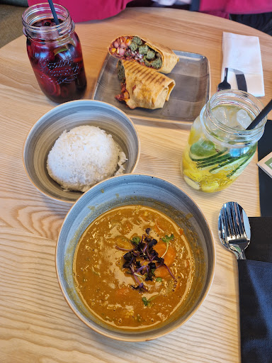 Read moreDas Essen ist sehr lecker und vor allem sehr frisch. Der Salat wurde auch getestet und war sehr gut. Alles wird sehr frisch zubereitet (Gemüse, schön bißfest, Fleisch (Wahlmöglichkeit Topping), Reis) und wir finden das dies für Ersttester solcher Gerichte (indischer?) sehr gut ist! Wobei der mutigere Part von uns fast alle Curry's, bis auf Erdnuss, ausprobiert hatte und meinte das die Schärfe nicht große Unterschiede machen würde. Ansonsten ist es geschmacklich so gut gewürzt, sodass man eigentlich kein Salz und Pfeffer braucht. Die Portionen sind üppig obwohl sie in ihren Schüsselchen nicht so groß ausschauen. Doch uns hat sie zur genüge gereicht. Wir haben sie kaum geschafft. Für mich ist es auch ein absoluter PLUSPUNKT das das Essen nicht wieder mit Zwiebeln oder Frühlingszwiebeln gekocht wurde. Dadurch kommen die Eigengeschmäcker der einzelnen Sorten mal richtig durch! Danke! Das einzige was aber bei den Curry's zu bemängeln war, ist das bei der Gemüseauswahl der Curry's keine Änderung einzelner Gemüsesorten zuläßt. Nur das Grundpaket vom Gemüse der beiden ersten Curry's sind anders als die beiden letzteren. Falls man diese Zusammenstellung lieber mag dann kann man sie tauschen. Doch es sind immer fertige Pakete die das dazugehörige Gemüse beinhalten. Das ist wirklich das einzige als Kritikpunkt. Auch die anderen angebotenen Gerichte sind auf den Tischen zahlreich vertreten gewesen. Personal ist unglaublich freundlich und hilfsbereit. Erklärt alles sehr genau! Unterschiedlichstes Publikum, was ich schön fand. Der zweite Stern, der fehlt, beim Ambiente, ist das für manche die Sitzgelegenheiten etwas hart sind. Auch mit Sitzkissen! Aber sonst ein sehr gelungenes und für mich nachhaltiges Projekt das hier entwickelt wurde. Dankeschön! Wir kommen...