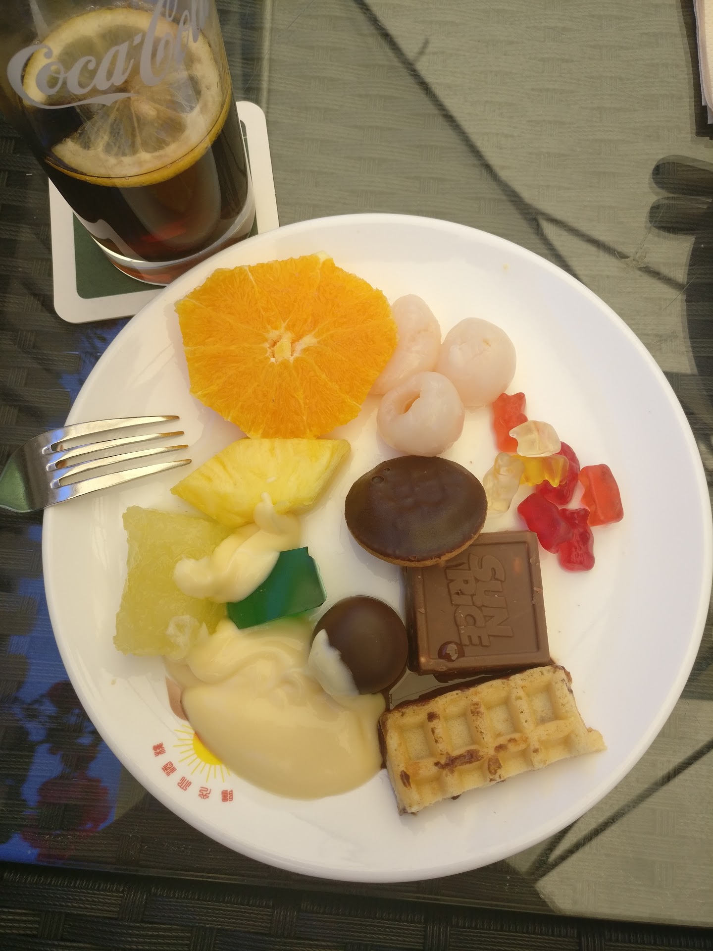 Essen: Grundsätzlich nicht schlecht und eine schöne Auswahl, bis auf die Billo-Desserts a la Aldi-Tiefkühltheke mit Wackelkontakt. Die Teller waren zum Teil nicht sauber. Die Pekingsuppe schmeckt nach wie vor, als wäre es der Koch Leid, sie jeden Tag erneut zu kochen. Wer weiss, vielleicht sogar schon verzweifelt und in den Behälter hineinweinend; Zumindest jedoch sehr unmotiviert das Suppgut nochmal abzuschmecken. Sushi ist ok, das Reis-Fisch-Verhältnis lässt jedoch offensichtlich das gewollte, möglichst schnelle und günstigste Sattmachen erahnen. Das chinesische Buffet wird laufend nachgefüllt und ist nicht mehr so übersalzen. Der Mongolengrill war diesmal vorzüglich. Wenn schon nicht auf Käfigfleisch, könnte jedoch getrost auf Haifisch und andere unnötige Exoten verzichtet werden, die der allgemeine Erlbnisuffetkevin sowieso weder hinterfragt noch würdigt und am Ende vielleicht nicht einmal aufisst. Für Vegetarier ist das Ganze leider ungeeignet.