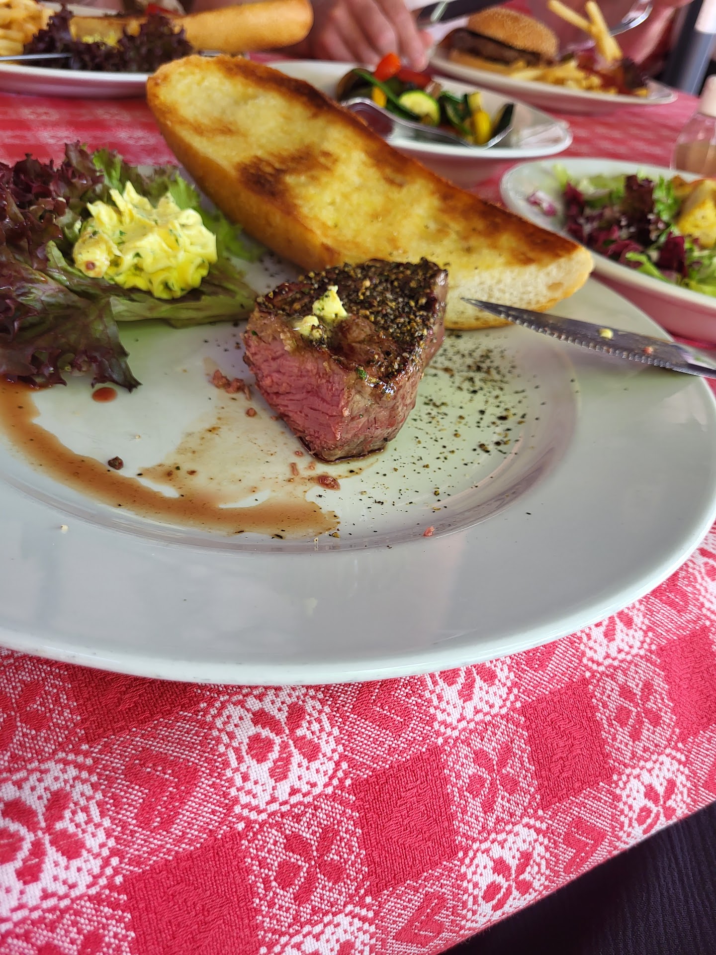 Fazit: Wenn man einfach nur ein gutes Steak essen gehen möchte, man in der NĂ€he ist, kann man hier sicherlich glĂŒcklich werden. Auswahl der Steaks beschrĂ€nkt sich auf die vier "Standart Cuts" (HĂŒftsteak, Roastbeef/Rumpsteak, Filetsteak und Entrecote/Ribeye) in vorgegeben GröĂen z.B. das Ribeye Steak gibt es nur als 300g Version. Das Ambiente könnte man als Mischung aus Steakhaus und Diner bezeichnen welches gut gelungen ist. Einen Garten / eine Terrasse gibt es auch, fĂŒr welche man aber vorher...