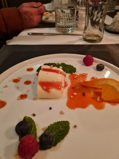 Da wir noch Hunger hatten, haben wir uns Dessert bestellt. Und der lächerlichste Moment war, als man uns dann augenscheinlich eine Portion Panna Cotta (siehe Fotos) auf zwei Teller aufgeteilt als zwei Portionen an den Tisch brachte. Zum Vergleich gibt es hier auf Google eine Bewertung von vor vier Jahren mit einem Foto und es ist klar, dass man uns eine Portion in der Mitte geteilt als zwei Portionen auftischen wollte. Auf Nachfrage beim Kellner hieß es dann, dass das eine normale Portion sei. Auch das akzeptierten wir, denn wir hatten uns mit dieser Lächerlichkeit an Service für den Abend abgefunden, bis dann der Kellner erneut an den Tisch kam und uns entschuldigend mitteilte, dass es bei den Panna Cotta in der Küche womöglich einen Fehler gegeben habe, und dass man diese nicht auf die Rechnung...