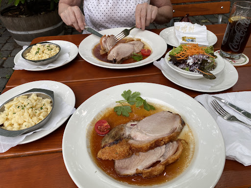 Das Essen ĂŒbrigens war okay - der Salat meiner Frau sah nicht so geil aus aber schmeckte gut und es wurde immerhin auf deb notorischebĂ€n Eisbergsalat verzichtet. Der Krustenbraten war ein klein wenig trocken aber fĂŒr den Preis okay. Der Beilagen-Kartoffelsalat schmeckte eher nach Dose (="Convenience"). Muss ich so schnell nicht...