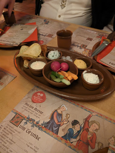 Read moreWaren am Samstag beim Ritteressen. Für mich persönlich steht das ganze nicht in Relation. Der Ritterkeller ist cool Ambiente is top. Wir sind mit 8 Erwachsenen Personen angereist. Zum Essen: Es gab vorweg eine gemüseplatte mit verschiedenen Aufstrichen mit einem halben Mini Laib Brot (größeres Brötchen). Ein paar Streifen rohes Gemüse und ein paar kleine Schälchen mit Aufstrich.Aber ein Brot muss man mit seinem Nachbarn teilen. Ich dachte okay egal ich konzentriere mich eher auf das Hauptgericht und das dann so alla Bud Spencer zu essen. Dann eine Flädlesuppe die war lecker vom Geschmack her aber zwei dickere StreifenFlädle drin mehr nicht war in zirka 10 Sekunden aufgegessen. Dann der Hauptgang eine Frechheit zwei haxen für 8 Personen. Das da jeder was bekommt muss man schon geschickt schneiden. Der Braten war ohne Biss fast roh und viel zu salzig. Die Würstchen waren lecker aber auch ne Handvoll das gleiche bei den spareribs. Dann gabs noch hänchenschlegel die dem Begriff Schlegel nicht würdig sind. So kleine Schlegel hab ich noch nie gesehen ehrlich. 3 Maultaschen, nicht lecker, bubenspitzle mit Sauerkraut viel zu wenig genauso wie das Gemüse. N paar halbe Semmelknödel die auch gut waren aber einfach zu wenig. Was mir noch unerklärlich ist wie man zwei haxen einmal lecker und einmal richtig unlecker zubereiten kann. Ich kann’s kaum erklären an der einen haxe hab ich n bissl an Knochen rumgenagt die war gut die andere nicht ungenießbar aber so das man kein Hunger mehr drauf hatte. Und das ganze für 8 Personen. Das war’s. Kein darf ich noch was bringen seit ihr satt hat’s geschmeckt? Nix. Enttäuschend! das Ganze kostet dann 45€ pro Person also dann alle zusammen 360€ für ne Platte die nicht überzeugt find ich persönlich abzocke. Ich hab mir da was ganz anderes vorgestellt.