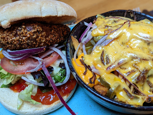 Read moreWir hatten einen Tisch Freitags Abends für 19:30 reserviert. Da hat alles gut geklappt. Wir saßen als einziger Tisch oben, was wir zuerst ziemlich gut fanden. Die Speisekarte haben wir uns selbst organisiert, da nur für 2 und nicht für 4 gedeckt war. Fanden wir jetzt noch nicht so schlimm. Die Bedienung war freundlich, aber nicht sehr kompetent. Wir hatten den Eindruck, dass sie ihren ersten Tag hatte - sie hatte im Grunde keinen Plan was auf der Karte stand (z.B. ob es alkoholfreie Cocktails gibt, welche Dips vorhanden sind). Nach der Bestellung kamen Essen und Getränke Recht schnell. Mein Halloumiburger war ok, leider gab es keine Burgersauce. Da war nur Ketchup und so ne fertige asiatische Chili-Süss-sauer-Sosse drauf. Und 3 Stücke Mango. Nun gut. Die Chili-Cheese-Fries sollten mit selbst gemachten Röstzwiebeln kommen - die waren entweder roh oder verbrannt. Aber im Grunde war das Essen selbst schon in Ordnung. Dafür gibt es hier auch die 2 Sterne. Aber nach dem Essen kam der Hammer. Es war noch nichtmal 21 Uhr, da kam die Bedienung wieder nach oben. Wir dachten um Dessert und Kaffee anzubieten. Nein, wir sollten zahlen kommen. Als um zehn nach 9 noch keiner von uns unten war (wir wollten ja noch austrinken!) würde einfach die Musik ausgemacht. Der absolute Rausschmeißer. Unten war der Laden tatsächlich schon leer, aber die offiziellen Öffnungszeiten waren bis 22 Uhr. Auf Nachfrage ob sich an den Öffnungszeiten etwas geändert hatte, kam nur "wenn wenig los ist, dann auch früher". Ich war selbst Servicekraft und habe noch nie so wenig Trinkgeld gegeben, wie an diesem Abend. Absolut unhöflich und Null kundenorientiert. Mein erster und letzter Besuch in...
