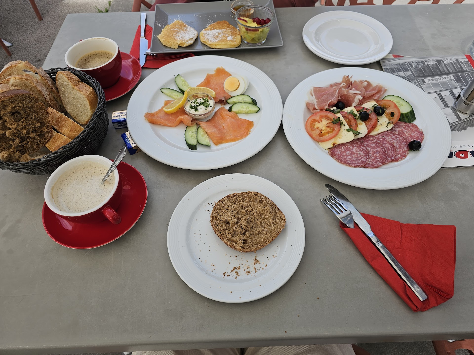 Unser Frühstück bestand aus einer Lachsplatte, einer Wurstplatte, Pancakes und zwei Cappuccinos - eine Auswahl, die auf den ersten Blick reichhaltig und appetitlich erschien. Allerdings variierte die Qualität unserer Speisen stark. Die Pancakes waren lecker, luftig und gerade richtig gebacken - ein wahrer Genuss. Der Lachs und die Wurstplatte hingegen waren eher durchschnittlich und blieben hinter unseren Erwartungen zurück. Der Basilikum, der die Platten garnierte, wirkte vertrocknet, als ob er vom Vortag stammen würde, und die Oliven waren enttäuschend geschmacklos. Das Baguette war zudem trocken, was den Gesamteindruck der Mahlzeit weiter trübte.