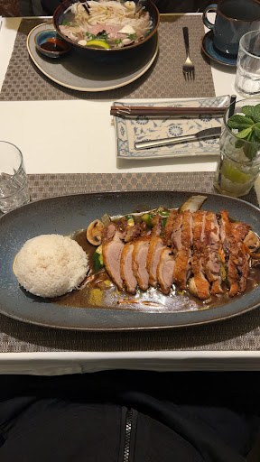 Essen: Die Speisekarte ist sehr gut gestaltet, auch viele vegetarische Gerichte. Nordchina und Vietnam sind die Regionen aus denen die Rezepte stammen. Wir bestellten als Vorspeise eine Suppe: Canh Chua Ca (Lachs und Garnelen, mit Zitronengras und Ingwer), als Hauptspeise Ente auf Curry mit Gemüse (u.a. Zuckerschoten, Ingwer). Weitere Hauptspeisen (befreundete Ehepaar): Reisnudelsuppe mit Koriander und ein vegetarisches Gericht mit einer Gemüsevariation Das Essen war sowohl optisch als auch geschmacklich hervorragend zubereitet. Serviert auf schönen großen eckigen Tellern, dekoriert mit Blüten. Nachspeise: ein vietnamesischer Kaffee (siehe Foto). Durch einen kleinen Edelstahlfilter tröpfelt das heisse Wasser über den frisch gemahlenen vietnamesischen Kaffee aus arabica Bohnen, am Glasboden ist eine süssliche Kondensmilch. Nicht nur optisch interessant. Schmeckt auch gut.