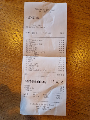 Bei den Getränken wurde einem unserer Kinder statt der Fanta ein Bier geliefert, das korrekte Getränk kam dann 5 Minuten nachdem alle anderen ihre Getränke hatten. Bei den Speisen kamen, mit entsprechender Geduld, drei der vier bestellten Speisen, das Kinderschnitzel (leider ebenfalls wieder bei dem Kind ohne Getränk) kam mit deutlicher Verspätung, wenn wir gewartet hätten bis alle ihr Essen gehabt hätten, wäre unser Essen kalt gewesen.