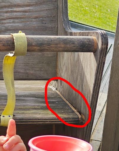 Ich fragte nach einem Hochstuhl für unsere Kleine, den wie auch schnell bekamen. Allerdings war dieser Marke Eigenbau, total wackelig, die Bänder mit Spaxschrauben befestigt und die Sitzfläche NICHT fest und nicht einmal eingerastet oder korrekt montiert ...sie hing quasi hinten an der aller letzten Ecke noch irgendwie halbwegs fest...ansonsten komplett daneben....siehe Bild Das kann sehr gefährlich für ein kleines Kind sein und diese eine Sache Kreide ich euch echt an das finde ich UNVERANTWORTLICH!