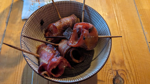 Als Nachtisch und so herum eigentlich unüblich, habe ich mir noch Datteln im Speckmantel bestellt, da ich so Appetit darauf hatte. Und es war perfekt. Der Speck war knusprig. Das ist auch eher selten.