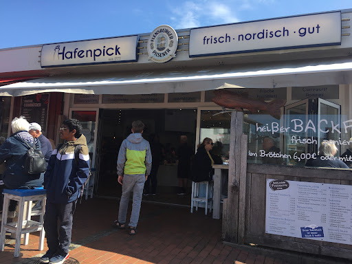 Read moreIch versteh den Hype um den Hafenpick nicht. Wir waren zwei Mal dort und waren zwei Mal unzufrieden. Die so viel gepriesene Qualität der Speisen konnten wir nicht in dem Maße erleben, wie es geschildert wird. Der Backfisch war relativ geschmacksneutral und innen sehr wässrig. Lässt man ihn sich einpacken (dort essen wollten wir ihn wegen der Atmosphäre nicht), so hat man, wenn man ihn nach 5 Min. wieder auspackt, ein zermanschtes Irgendwas vor sich. Denn: man packt den Fisch nicht in, sondern auf das Brötchen. Mit Soße drauf wird das eine schöne Sauerei in der Tüte. Die Portionen sind auch nicht so groß, wenn man Krabbenbrötchen oder Matjes bestellt, aber im Vergleich zum Gosch nebenan noch o.k. Der Service: man wird gefragt, was man will und stellt nach kurzer Zeit fest, dass Stammkunden, welche mit dem Vornamen angesprochen werden, als erstes bedient werden, obwohl sie zuletzt den Laden betreten haben. Fragt man dann nach einiger Zeit mal nach, wann man endlich seine Brötchen bekommt (es wurden in der Zeit nach mir bestimmt 10 Backfische bestellt und verkauft), heißt es nur: bei uns wird alles frisch gemacht. Ja schön, aber eine Reihenfolge gibt es wohl nur so, wie es der junge Herr hinter der Theke für richtig hält. Und mit dessen Art muss man auch erstmal klar kommen. Etwas sehr hyperaktiv. Die Atmosphäre: sehr eng, sehr laut, sehr geruchsintensiv. Lädt nicht unbedingt zum Verweilen ein. Da loben wir uns die Hafenkantine im Lighthouse gegenüber. Man wird anständig bedient, die Speisen sind hervorragend in Größe und Qualität, der Preis passt (im Hafenpick ist es...