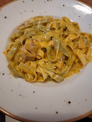Read moreDas Essen war schmackhaft. Pilze mit Spinat in Gorgonzolacremesauce - eine üppige Portion, zartere Personen wären davon sicher bereits vollständig satt. Es gab dazu zwei sehr wohlschmeckende Brötchen, ideal um die Sauce aufzutunken. Die hausgemachte Limonade war ebenfalls gut. Als Hauptgang Pizza mit Lachs und Krabben als extra Gorgonzola. Die Aromen kamen schön heraus, der Rand war knusprig. Die inneren 2/3 des Pizzabodens waren nicht knusprig sondern zusammen mit dem Belag eine weiche Masse. Allerdings wird das seit einigen Jahren ja in vielen Restaurants so serviert, sei also akzeptiert, geschmacklich ist es auch nicht unbedingt von Nachteil, so kann man immer etwas Rand und etwas Inneres zusammen aufgabeln und hat knusprig und Saftig in einem. Ebenfalls schön üblich geworden, daß es zum Hauptgang kein neues Besteck gibt, dennoch für mich immer noch ein Verfall der Sitten. Vom Kellner ( durchaus freundlich) mit Blick und Kopfbewegung aufgefordert zu werden, die Gabel vom Vorspeisenteller an mich zu nehmen ....das hat einfach keinen Stil....insgesamt war der Kellner sehr freundlich und angenehm, ich sah aber, daß am Nachbartisch eine übergeschwappte Kaffeetasse serviert wurde, das gehört zurück in die Küche und nicht auf den Tisch des Gastes. Ein Missgeschick kann immer passieren, nicht schlimm, nur das dem Gast vorzusetzen.... Zum guten Schluß: die Preise sind wirklich günstig,damit sei der mangelnde Stil verziehen. Ich würde jederzeit...