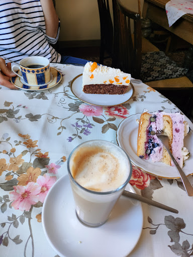 Wunderschönes Café im Stil der 30ger Jahre. 3 sehr nette Damen verwalten das gemütliche Café, es ist die Mutter mit ihren erwachsenen Töchtern. Ganz abgesehen von der hohen Qualität des reichhaltigen Angebotes der süßen Waren - selbst gemachte feinste Kuchen 🥧 und Leckereien, Kaffee ☕ in allen Geschmacksrichtungen- fielen die Damen durch Freundlichkeit, Verbindlichkeit und Zuvorkommenheit auf. In kleinen Ecken und Nischen sitzt man auf bequemen barocken Sesseln an runden oder nierenförmigen Tischen. Antikes Ambiente. Bilder und ausgefallene Porzellanwaren sind z.T. verkäuflich. Die besondere Atmosphäre lädt zum ausgedehnten Verweilen ein und zum Versprechen, bald möglichst...