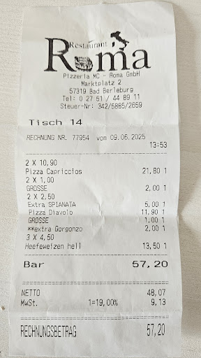 Read moreGoed Italiaans restaurant in Bad Berleburg. De eigenaar is een Italiaan die samen met zijn gezin het restaurant runt. Het is gelegen aan een autovrij plein midden in het stadscentrum van Bad Berleburg. Parkeerplaatsen zijn langs het restaurant er zijn zelfs enkele geserveerde plaatsen voor gasten van Pizzeria Roma. Toen we binnen zaten misten we iets, maar we wisten niet wat, toen de radio na een half uur werd aangezet wisten we het.