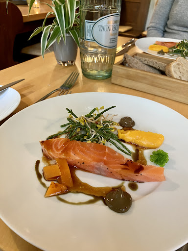 Ein großartiges, feines und zugleich gemütliches Restaurant! Dank des Michelin Guides bin ich auf dieses etwas versteckt gelegene Restaurant aufmerksam geworden und schließe mich den positiven Bewertungen an. Denn das Preis-Leistungsverhältnis ist einfach grandios. Es handelt sich optisch um eine kleine Weinstube, die mit viel Holz ausgestattet ist, sodass man sich einfach wohl fühlt. Die Einrichtung ist eher einfach gehalten, während das Essen sehr schick angerichtet wird. Es empfiehlt sich je nach Uhrzeit übrigens zu reservieren, da die Weinstube nur begrenzt Platz bietet und sehr beliebt ist. Meine Mutter und ich haben schließlich zweimal das Menü bestellt, zu dem etwas Brot gereicht wird. Bereits der erste Gang hat mich überzeugt. Der Lachs in Kombination mit dem Salicorne, dem Kürbis, Kaviar und der perfekt abgestimmten Vinaigrette beschert ein wahres Geschmackserlebnis. Der Lachs selbst ist butterweich und vorzüglich, sofern man wie ich gerne rohen Lachs isst. Als Hauptspeise gab es Adlerfisch mit Kürbisrisotto. Normalerweise bin ich kein Fan von Kürbiskernöl, aber in dieser Kombination hat es mir sehr gut gefallen. Das Risotto war perfekt gesalzen, was immer eine Herausforderung ist. Zum Abschluss gab es ein köstliches Dessert, das aus Haselnussmousse auf einer Waffel nebst Eis, einer Art Vanillecreme etc. bestand. Alle Noten sind sehr gut aufeinander abgestimmt und ich bin rundum begeistert. Fazit: Ein tolles Restaurant, das ich wärmstens weiterempfehle. Der Service ist sehr aufmerksam und zuvorkommend! Das Essen ist vorzüglich und man bekommt hier...