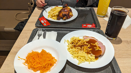 Wir waren heute zum jungen Nachmittag dort essen unser erstes Problem es war wenig Auswahl und ich hatte die "schinkennudeln " genommen unter dem Licht sahen diese einigermaßen appetitlich aus und als ich diese dann bekam war es eine Hand voll Nudeln mit etwas billig Tüten Soße von schinken war nichts zu sehen und die 2 Mini Stücke ei waren komplett ausgetrocknet die Hälfte der Nudeln waren schätzungsweise 2 Minuten ins heiße Wasser geworfen und waren Steinhart und ungenießbar so mit hatte ich nach der halben halbwegs genießbarer Hand Nudeln eigentlich so weit kaum was davon gehabt und 6,50€ dafür bezahlt Schweinerei mein Opa hatte lachs mit Gemüse und Bratkartoffeln diese waren schwarz und latschig und mit Fett voll gezogen das Gemüse schmeckt wie 2 Tage zuvor vorbereitet und ungekühlt irgendwo 2 Tage rumgestanden der lachs war eigentlich genießbar und dafür auch 7,60€ also früher war es deutlich besser und wir fanden es war ein totaler Reinfall und wir sagen nur NIE WIEDER das Personal war ziemlich unfreundlich es geht nicht unfreundlicher fanden wir persönlich und es ist sehr unverschämt das so etwas überhaupt verkauft wird es ist eine Zumutung sowas den Gästen...