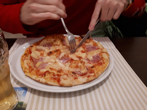 Habe meine Frau aus ihrer Reha abgeholt und wollte am Abend vor der Abreise mit ihr schön Essen gehen. Uns wurde dieses Restaurant von Mitarbeitern in der Rehaklinik empfohlen. Der Service war aufgrund des wohl "großen" Andrangs leicht überfordert, jedoch nie unhöflich! Bestellt haben wir 1x Bruschetta, 2x Hähnchenbrust vom Grill mit Beilagen bestehend aus wahlweise Pommes oder Kroketten, Salat oder überbackenem Gemüse. Meine Frau wählte den Salat und die Kroketten und ich die Pommes und das überbackene Gemüse. So, nun erstmal zur Bruschetta. 3 Scheiben geröstetes Weißbrot mit einer wohl vor einer Stunde aus dem Eisfach entnommenen Auflage aus Tomaten, Zwiebeln und Knoblauch wie man sie kennt. Aber KALTE Auflage? Geht überhaupt nicht! Weiter zur Hähnchenbrust vom Grill (vielleicht maximal 100g pro Portion) und den Beilagen! Serviert auf einem Teller mit Kräuterbutter (eigene Rezeptur? extrem salzig, sie schlug uns beiden nächste Nacht mächtig auf den Magen), Salatblatt und Orangenscheibe (warum auch immer?). Die Beilagen, ausgenommen der Salat, kamen etwas später. Serviert wurden diese in Krankenhaus-Schalen! Der Salat war ok, die Kroketten und die Pommes auch (jedoch leider wohl von Aldi oder Lidl, der 5mm Feinschnitt, aus der Tiefkühltruhe). Nun zum meinem überbackenem Gemüse!!!! In einer Backform serviert wurden 2 kleine Brokkoli-Röschen und 3 hauchdünne Scheiben Zucchini (ich kam aus dem Lachen kaum raus). Alles überbacken mit viel Käse! Nun noch zum krönenden Abschluss! Ich bestellte mir noch einen Espresso!!!!! Na ja, wenn es 10ml waren, war es schon viel, die Espresso-Tasse war noch nicht mal zu ¼ gefüllt und ich hatte Angst in diese Pfütze Zucker hinein zu tun. Alles in Allem ein sehr überteuerter Abend (Rechnung über 50€). Fazit!!! Unseren Beobachtungen zu Folge ist es kein Wunder, dass fast alle anwesenden Gäste eine Pizza...