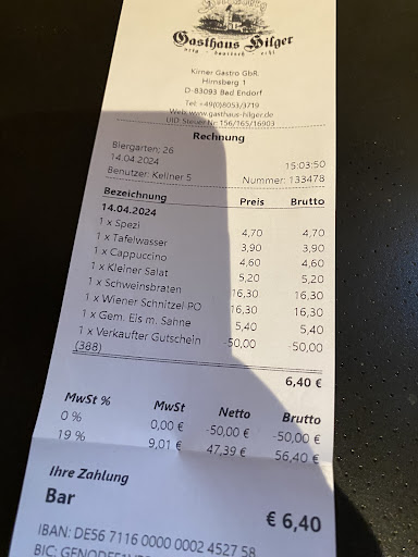 Read moreSo 18:00 Uhr beim Hilger nach einem Tisch für 2 Personen mit Hund gefragt. Wir hatten nicht vorher reserviert. Uns wurde ein Tisch zugewiesen. Ob der Tisch für später reserviert ist, wurde nicht erwähnt. Nach unserer Bestellung ca. 1/2 h auf das Essen gewartet was eine angemessene Wartezeit ist. Nach zügigem Verzehr der durchaus guten Speisen, kam um 19:00 Uhr, also nach einer knappen Stunde nach unserem Eintreffen, die Bedienung an unseren Tisch und wollte abkassieren. Meine Frau hatte noch nicht mal ihr Getränk ausgetrunken!! Keine Frage, ob uns das Essen geschmeckt hat, ob wir noch was trinken wollen, oder vielleicht noch eine Nachspeise möchten. Ich sagte dann, dass wir gerne noch eine Nachspeise gehabt hätten. Daraufhin die Bedienung: es warten Leute auf unseren Tisch, es täte ihr leid, aber eine Nachspeise ist nicht mehr drin, wir könnten diese ja mitnehmen (hää!!??: bei 34 Grad im Schatten Apfelstrudel mit Vanilleeis mit nach Hause nehmen??!!). Auf unsere Nachfrage, ob unser Tisch ab 19:00 Uhr reserviert wäre, wurde dies von der Bedienung verneint. Die am Eingang wartenden Personen wurden von uns gefragt, ob sie reserviert hätten. Diese Frage wurde von allen verneint. Das Verhalten der Bedienung kommt einem unfreundlichen Rausschmiss gleich. Das sind wir von der heimischen Gastronomie nicht gewohnt! So etwas gehört sich einfach nicht! Respekt vor dem Gast sieht anders aus. Gottseidank sind wir von den vielen anderen Gastonomiebetrieben Anderes gewohnt. Wir werden uns weiterhin Lokale aussuchen, von denen wir wissen dass wir dort willkommen sind. Es gibt...