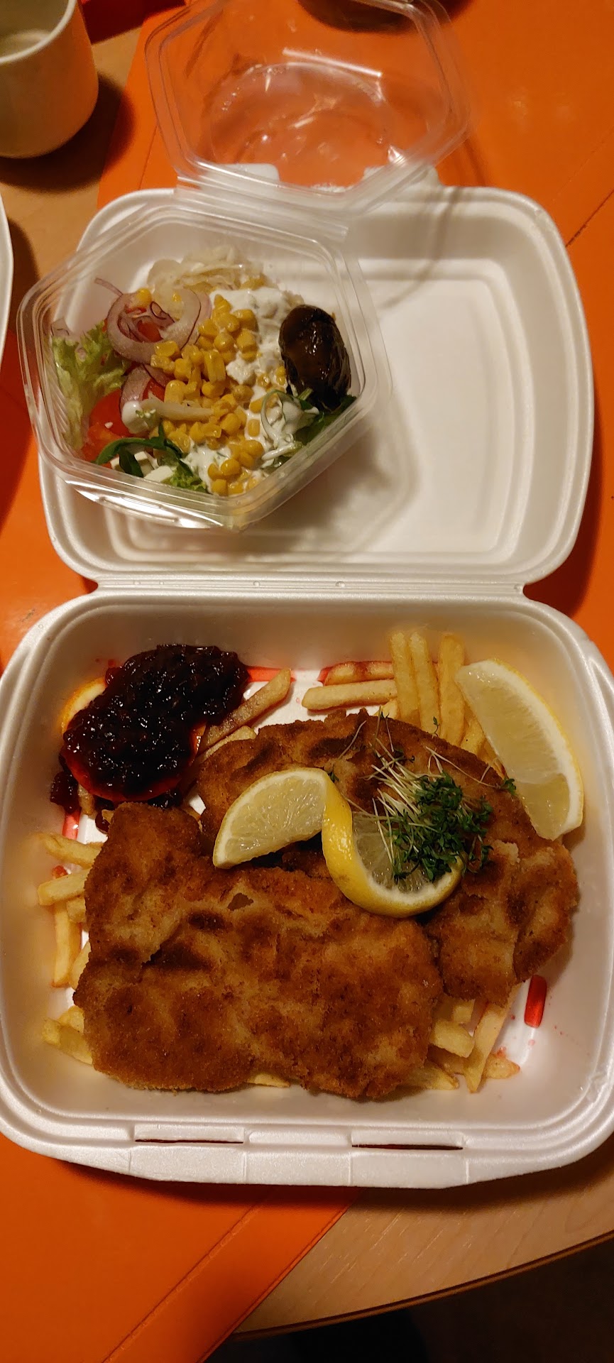 Read moreErwartungen voll erfüllt! Auf Empfehlung eines Bekannten haben wir uns was bestellt zum abholen. Die einfachsten Gerichte sind bekanntlich oft die schwierigsten. Also haben wir uns für das Schnitzel "Wiener Art" entschieden. Es war einfach super. Geschmacklich könnte man es nicht besser machen. Ordentlich gewürzt und auch hervorragend gebraten. Trotz Abholung war die Panade zuhause noch knusprig. Die Pommes möchte ich nicht bewerten da diese ja bekanntlich etwas weicher werden durch die Feuchtigkeit bei Abholung. Die Salatauswahl war passend, nur die Tomaten waren leider etwas mehlig und die Gurken könnten etwas Salz vertragen aber trotzdem gibt es hier die vollen Punkte. Wir werden garantiert wieder kommen. Es ist eine ehrliche und freundliche Küche. Man fühlt sich sofort wohl. Die Einrichtung ist einfach passend. Ein Mix aus Moderne und Tradition. Hell, freundlich und einladen.