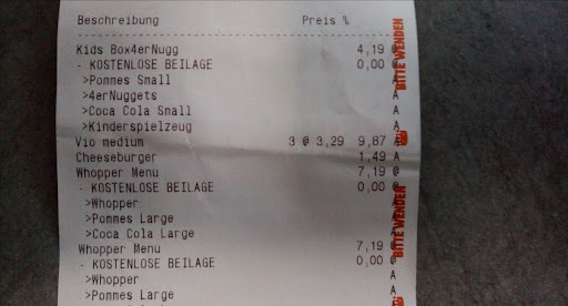 Die Dame ist sichtlich genervt und reagiert patzig. Eine Stornierung direkt zurück auf die ursprüngliche Karte sei nicht möglich und sie bringt uns ein ausgedrucktes A4 Formular auf dem wir Kontaktdaten eintragen, Kreuzchen machen und unterschreiben dürfen um unser Geld zurückzubekommen. Auf dem Formular fehlt ein Kreuzchen für unser Anliegen. Egal. Schnell machen und weg hier. Weitere Menschen schließen sich unserer Entscheidung an, als sie die Möglichkeit wahrnehmen. 2h gestohlen. Kein Essen und Trinken. Absolute Katastrophe. Es sind drei Frauen und ein Mann in der Schicht. Soweit ich es mitbekommen habe. Wobei sich der Mann um sämtliche Burger und die Küche kümmert. Während die Damen Burger zählen, sich dabei über die Schulter schauen, hin- und herschleichen ohne irgendwas anzufassen und ohne erkenntlichen Grund. Nur Verwirrung und vermutlich der Versuch die Arbeitszeit mit so wenig Arbeit wie möglich abzuschleichen.
