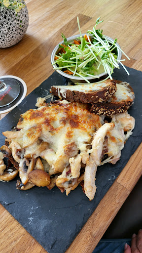 Wir haben uns einen vegetarischen Flammkuchen mit Champignons zu zweit geteilt, da er sehr groß ist. Eine Brotzeit mit Ei und Schinken auf Graubrot wurde bestellt und noch jeweils zwei unterschiedliche Waffeln mit Beilagen (Eis, heiße Kirschen, weiße Schokolade etc.) zum Nachtisch. Dazu für alle ein Heißgetränk mit der Bezeichnung "Techtelmechtel", was eine Kombination aus Kaffee und Kakao ist. Unglaublich lecker, sehr sättigend und schön angerichtet.
