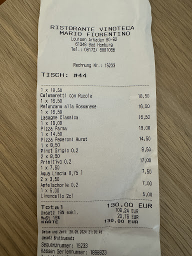 Read moreUnser Besuch im Mario Fiorentino Ristorante in Bad Homburg war eine absolute Katastrophe. Schon zu Beginn mussten wir 20 Minuten warten, nur um überhaupt eine Bestellung aufzugeben – und das, obwohl das Restaurant fast leer war! Der Kellner wirkte völlig desinteressiert und nahm uns sogar die Gabeln weg, ohne neue zu bringen. Wir saßen da und hatten einfach kein Besteck, während unser Essen kalt wurde.