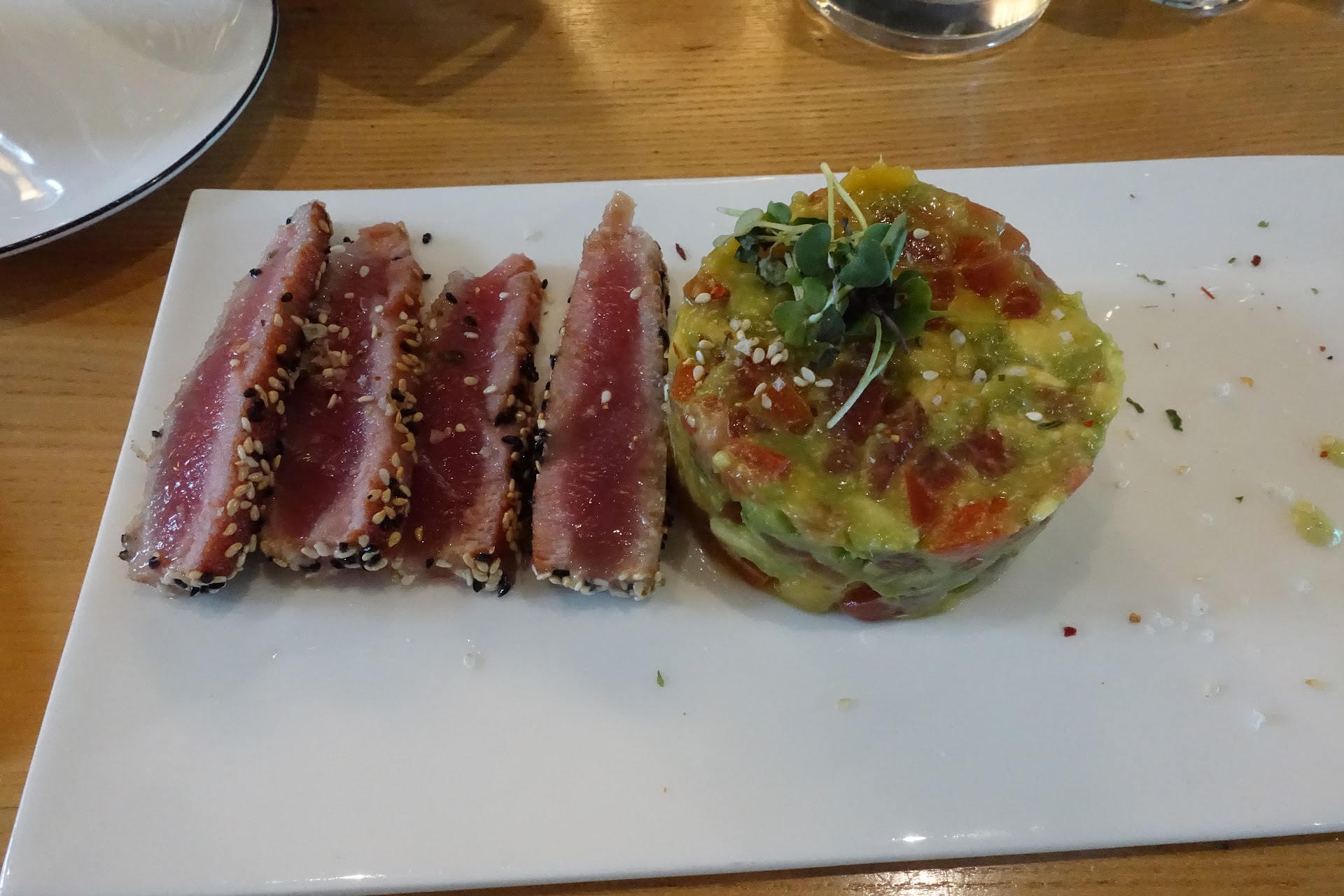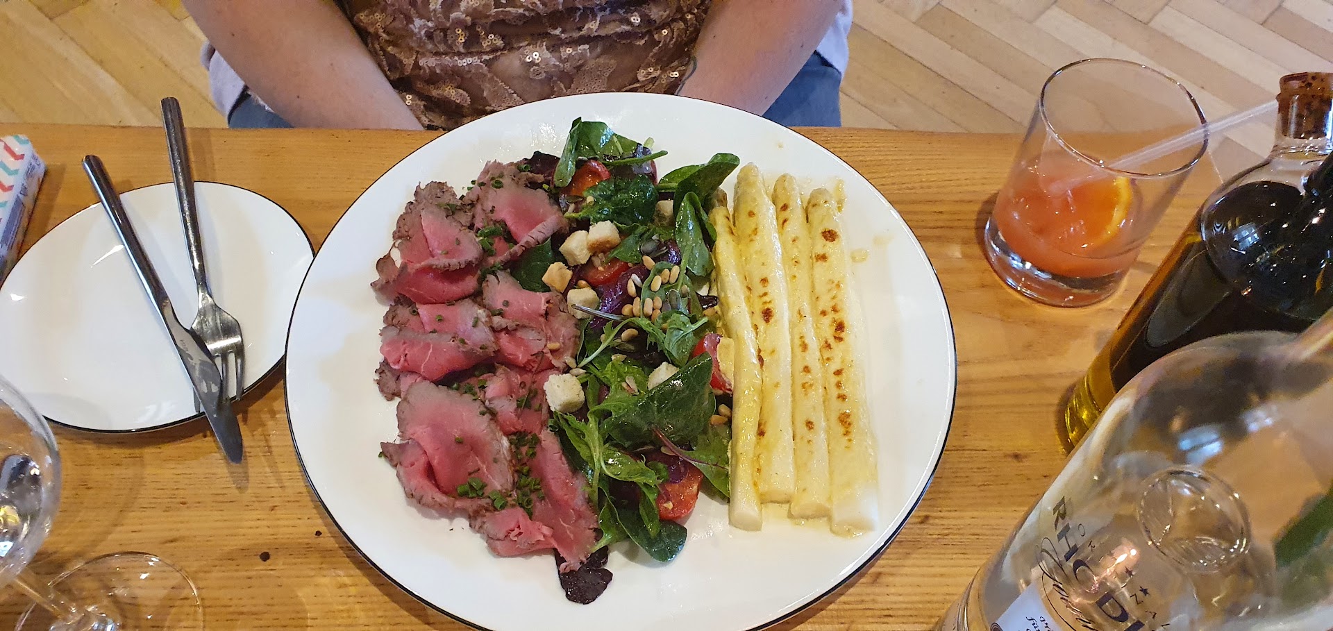 Eine Anmerkung noch zu Baguette und Olivenöl vorweg. Grundsätzlich keine schlechte Idee, aber dann sollte das Öl nicht in einem etwas angeschmuddelten Balsamico-Öl-Spender serviert werden und es sollte für den puren Verzehr auch ein hochwertiges Öl sein. Das servierte Öl war weder fruchtig noch bitter oder scharf.