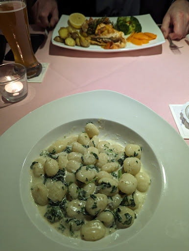 The prices had us expecting something better than what we were served. When asked about the weekly special fish platter, the waitress, who was very sweet, had no idea what was in it and had to go to the kitchen to ask. Along with the assorted fish (not served hot, but just warm) were unseasoned boiled carrots and broccoli. The Gnocchi alla Gorgonzola was served very hot with a nice creamy sauce. However the gnocchi were the same as any purchased at a Lidl or Aldi. There was no garnish and the baby spinach was so sparse it was imperceptible on the palate.