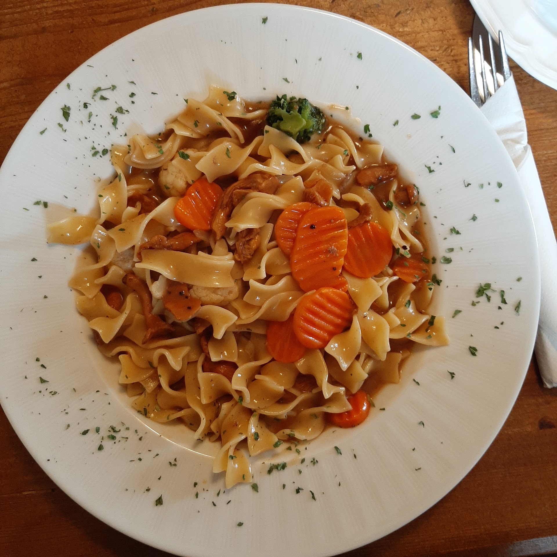 Eigentlich hätten wir nicht damit gerechnet, fernab vom touristischen Zentrum Bad Közting oben auf dem Berg nach 13:30 noch auf ein geöffnetes Lokal zu treffen. Das urgemütliche, wunderschön idyllisch neben der Kirche gelegene Gasthaus Zur Klause hatte geöffnet. In harmonischer Atmosphäre saßen einige wenige, aber offensichtlich zufriedene, vom Personal und der Klausen-Chefin persönlich bestens betreute Gäste. Wir bestellen Käsespätzle und Pfifferlinge mit 9 Gemüsen auf Bandnudeln. Es war das köstlichste Essen seit Langem für uns: Alles absolut frisch und delikat abgeschmeckt, appetitlich kredenzt, mit frischen Kräutern bestreut. Ein Gedicht. Note 1 mit Stern der Köchin. Meine Mutter hat so unerwartet und überraschend ein hervorragendes Geburtstagsessen genießen dürfen, abgerundet von frisch zubereiteten Waffeln mit Zimt-Sahne und Amaretto zum Kaffee. Meine Mutter und ich DANKEN der wunderbaren Chefin und ihrem freundlichen Personal für unseren gelungenen Aufenthalt. Wir haben bereits einen nächsten Besuch hier beschlossen. Dann jedoch werden wir mehr Gäste sein, evtl planen wir sogar einen Familien Ausflug hierher. Mutti und ich freuen uns schon jetzt auf ein Wiedersehen. Bis dahin Tschüß, ciao und Danke, Kerstin Bleinroth mit Mutter Ursula...