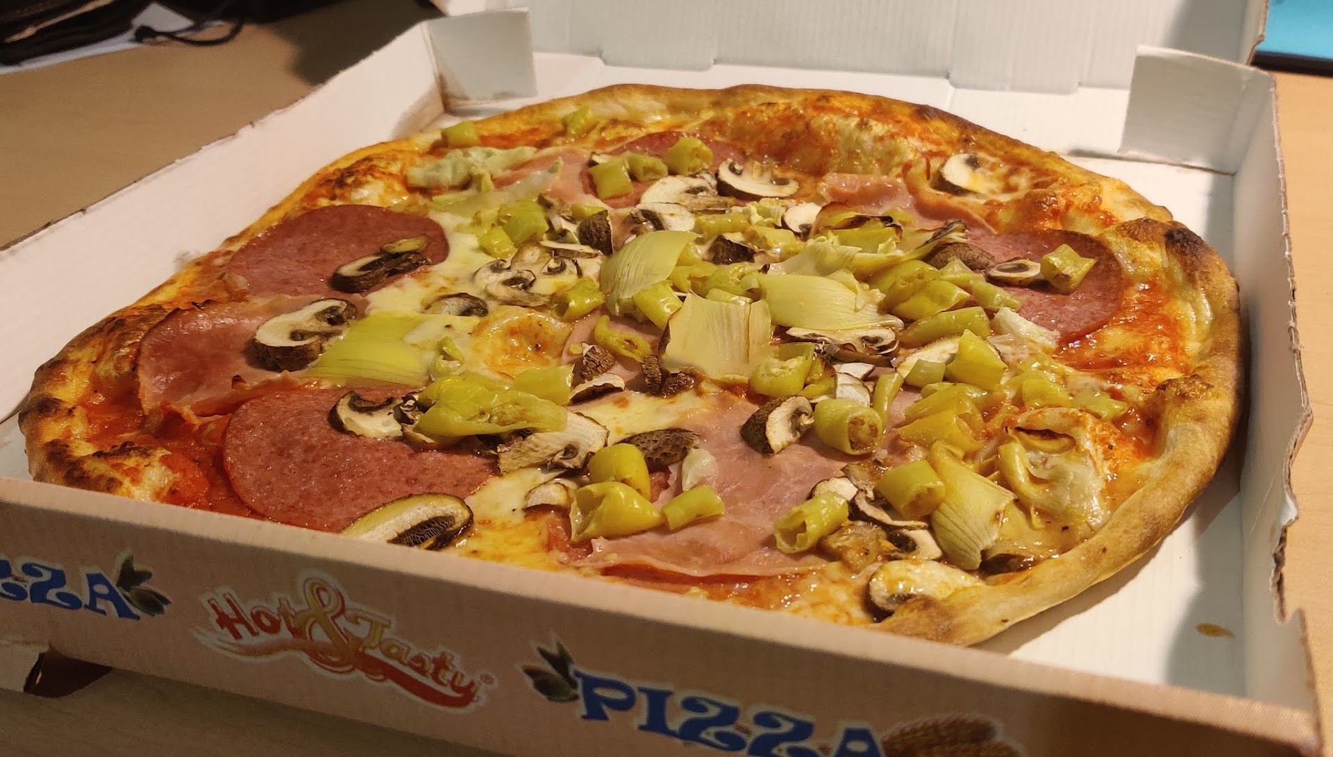 Read more(Pizza war zum Mitnehmen / To Go) Die Pizza hatte einen sehr weichen und dünnen Boden. (Leicht zäh, aber lecker) Der Rand war schön dünn und ebenfalls sehr weich. Der Belag war schön viel. Gewürzt wurde lecker. Käsemenge war richtig.