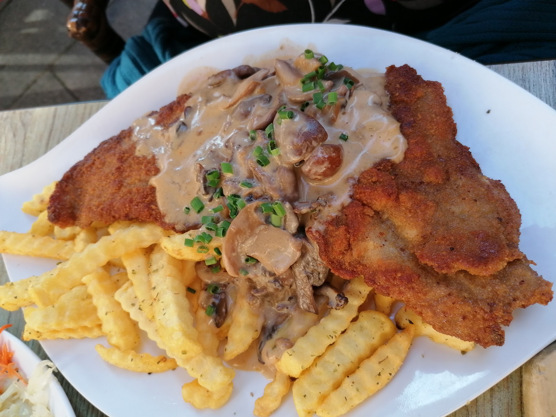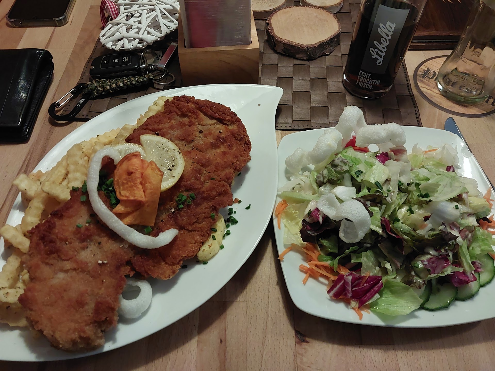Unser Essen kam dann ziemlich spĂ€t 1,5 Stunden nach Bestellung.. der Hunger war also schon groĂ. Leider fehlte bei einer Person der Beilagensalat. Dieser wurde recht zĂŒgig nachgereicht. Aufgrund des Platzmangels, hielt ich meinen Beilagensalat in der Hand. AuĂerdem war all das Essen war ziemlich eng aneinander gestellt. Kaum Möglichkeit, nicht dem Nachbarn beim schneiden, einen Ellenbogen in die Quere zu legen. Ich hatte allerdings auch keinen Platz den Salatteller abzustellen, nachdem ich fertig mit essen war. Zu den Hauptgerichten gibt es gute und auch schlechte Bewertungen. Ich hatte das Schweitzer- Schnitzel und muss sagen es war geschmacklich wirklich gut. Auch die SpĂ€tzle fĂŒrs Kind waren sehr leckerđđ». An unserem Tisch wurde auch ein Hirschgericht bestellt. Leider erinnerte es geschmacklich eher an einen alten Schafbock... Wahrscheinlich wurde der Hirsch brunftig geschossen. FĂŒr Menschen die so einen Geschmack nicht mögen, schade um das Gericht und den doch teueren Preis. Bei den GetrĂ€nken gab es auch hin und wieder Schwierigkeiten. Es wurde von den Kellnern nicht gesehen wenn ein GetrĂ€nk leer war. Wahrscheinlich dem Betrieb geschuldet. Bis Mann dann eine neue Bestellung aufgeben könnte ( nimmt ja auch nur ein Kellner auf, was einem leider auch ziemlich oft gesagt wurde...) Die Kellner waren grundsĂ€tzlich freundlich allerdings merkte man ihnen an dass sie ziemlich im Stress waren. Hierbei verlor es sich auch ab und an in der Umgangsweise mit uns GĂ€sten. Es wurden pampige Antworten gegeben, diskutiert dass hier nur frisches Fleisch verwendet wird ( was bei dem Hirsch ja auch keiner angezweifelt hat, nur eben dass er brunftig geschossen wurde), es wurde am GetrĂ€nk gerochen und mit ziemlich böser Stimmlage gesagt: "es ist das was sie bestellt haben, das steht in meiner Bestellung"⊠, dies und noch mehr "Freundlichkeiten" kamen Recht oft von einem Kellner ... Alles in allem wĂŒrde ich nicht wieder kommen, dafĂŒr habe ich schon viel netteren Service erlebt. In dem sich jeder Gast als Gast gefĂŒhlt hat, nicht wie hier in dem Unterschiede gemacht werden zwischen Leuten die Mann kennt( mit welchen man private GesprĂ€che fĂŒhrt, lacht und immer eine netten Auftritt hinlegte) und eben den "Anderen GĂ€sten", die wenn denn mal Zeit war abgefertigt werden. Das ist mir bei unserem Besuch leider als gröĂter negativer Punkt aufgefallen. Leider, denn das Lokal ist schön gelegen und sieht von auĂen wirklich ansprechend aus. Wenn aber die Freundlichkeit fehlt , nĂŒtzt all das schöne ĂuĂere leider...