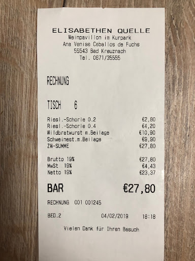 tja, die Elisabethenquelle hat ja gute Essensbewertungen, dachten wir und buchten per Kontaktformular auf der Homepage einen Tisch für zwei Personen mit dem Hinweis „essen und trinken“, den wir auch bestätigt bekamen, vor Ort erlebten wir eine Absurdität sondergleichen, „unser“ Tisch (gerade mal groß genug für zwei Leute, wenn sie essen und trinken wollen) war schon von drei Personen besetzt und man sagte uns, wir könnten uns ja auf die zwei freien Plätze dazu setzen, (es waren noch viele Tische frei), sie würden keine Tische für zwei Personen reservieren, es sei mir auch am Telefon so gesagt worden, meinte die Bedienung, nachdem ich ihr klar machte, dass sie uns verwechseln muss, meinte sie, das würde auch nichts ändern, es müssten sich noch weitere Personen an den Tisch setzen dürfen, wohlgemerkt, bei der Hitze ging es um Terrassenplätze und wir hätten auch Raucher am Tisch beim Essen annehmen müssen; Wir hätten unter solchen einzigartigen Bedingungen am Kunden vorbei (wir haben so einen Unfug noch nie erlebt) verständlicherweise nicht gebucht, wie alle, die wir kennen, auch; denn zu fünft an den kleinen! Tischen zu sitzen wäre auch mit Freunden ein zweifelhaftes Vergnügen, mit den Tellern und Besteck in der Hand oder auf dem Schoß, damit die Gläser auf dem Tisch Platz haben; absurd und völlig uneinsichtig!, wir sind gegangen und können die Elisabethenquelle wegen so eines abstrusen Umgangs mit Gästen überhaupt nicht empfehlen! Wir geben hier nur einen Stern, auch wenn wir das Essen nicht bewerten konnten, weil das Verhalten der Servicekraft völlig...