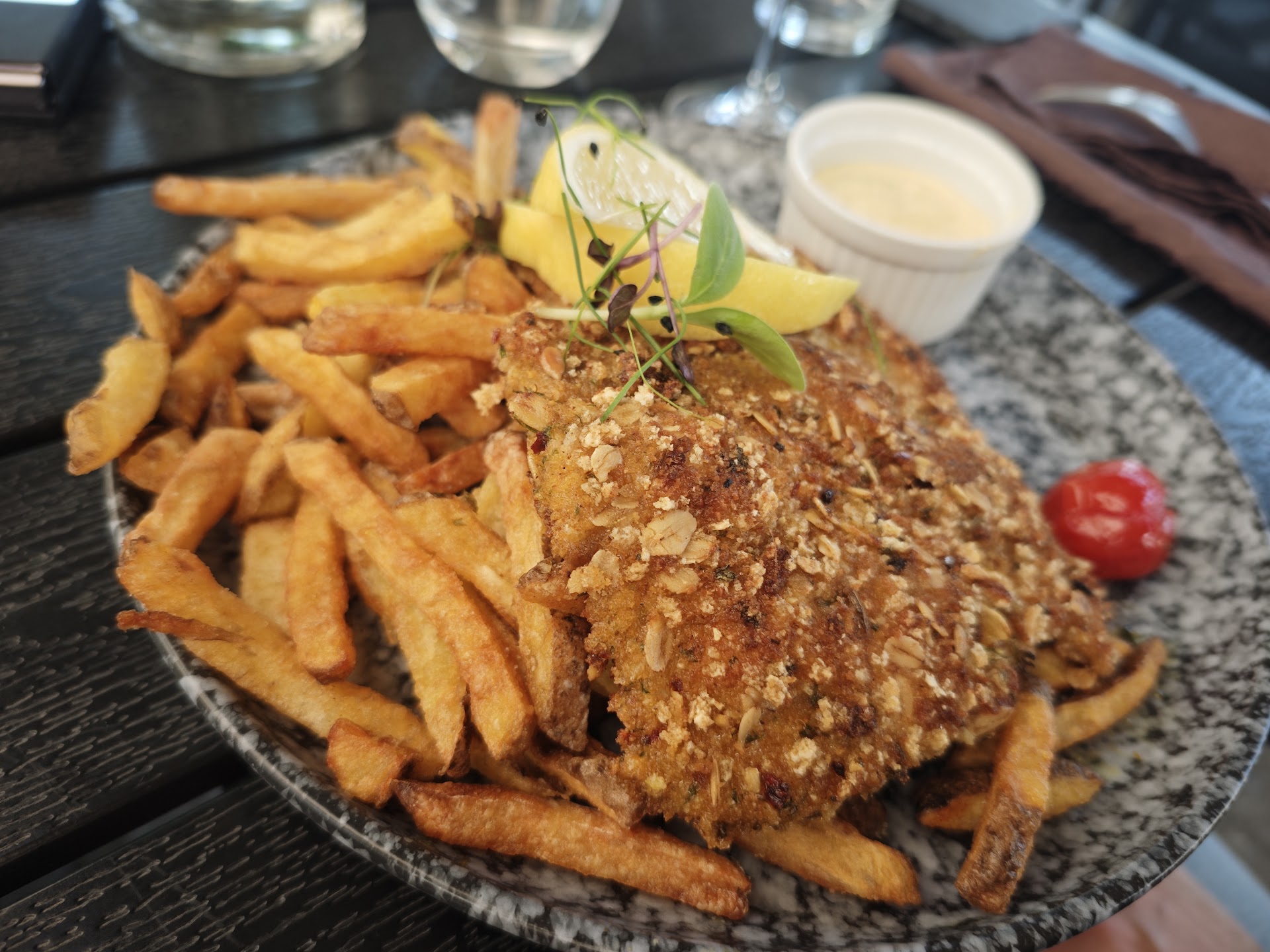 But let’s talk food: The appetizer of kandierter Ziegenkäse with Feigen-Senf and Rhabarber-Chutney was a dream—sweet, tangy, and perfectly balanced. And the Frühlingsschweineschnitzel with its homemade Kräuter-Parmesan crust was out of this world. Every bite was packed with flavor and clearly made with care.