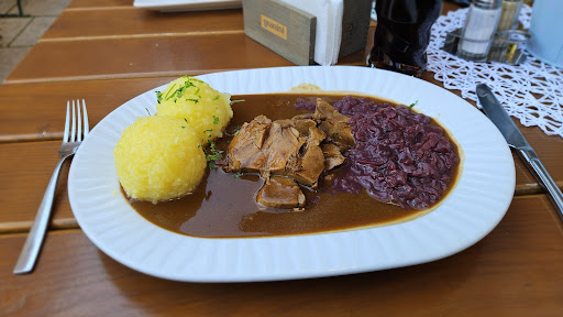 Beim Essen jedoch Licht und Schatten: Die Klöße mit Schweinemedaillons in Schwarzbiersoße und Rotkohl waren insgesamt essbar. Fleisch, Soße und Klöße ganz okay, wenn auch eher fad (nachsalzen hilft). Der Rotkohl dagegen völlig zerkocht und geschmacklos. Die „Currywurst“ war eine Bockwurst mit Soße, die leider kaum nach Curry schmeckte, für unseren Geschmack kein gelungenes Gericht. Das Kindergericht (Dino-Schnitzel mit Pommes) war immerhin solide und kindgerecht.