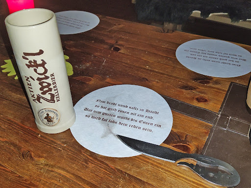 Read moreIst was " besonderes" ..... Wir waren am 6.11.21 Gäste bei einem sehr geselligen Gelage mit Speisen, Trank und Musik. Der Speisekarte entsprechend bestellten wir 2 Gelage. Einmal Bauern, einmal Rittergelage. Pro Person werden für das erste Gelage 24 Taler 9 Silberlinge und für das 2 Gelage 34 Taler 9 Silberlinge ( auch in Euro umzusetzen) aufgerufen. Ein Gelage ist ab 4 bzw. 5 Personen zu buchen. Getränke extra. Als unsere beiden Gelage kamen, schauten wir uns alle fragend an, ob es denn wohl für alle reichen würde? Wir waren immerhin 12 Personen. Leider bekam, wie schon geahnt, nun nicht jeder von allem ein Stückchen ab. Enttäuschung machte sich breit, zumal im Hinterkopf die Frage aufkam, wo der Wert der einzelnen Gelage war? Beide Gelage entsprachen aus unserer Sicht nicht dem Wert der pro Kopf veranschlagten Summen ( s. oben). Auch bekamen wir die im Rittergelage ausgewiesen Flasche Maultrunk zur freien Verfügung nicht. Lediglich der Maultrunk des Bauerngelage wurde auf Wunsch einigen verabreicht. Auf Nachfrage bei der Bedienung, wäre das so abgegolten. Bei der Abrechnung unserer Getränke dann das nächste Dilema. Wir hatten unter anderen zwei Wodka/Energie...., lt. Karte 6 Taler 5 Silberlinge. Auf der Rechnung dann 7 Taler 5 Silberlinge. Da jedoch irgendwie noch zwei zusätzliche, nicht von uns bestellte Longdrinks auf unsere Abrechnung gelangten und diese von der Bedienung nicht mehr zugeordnet werden konnten, mußten wir diese bezahlen. Also nochmals 15 Taler. Ganz am Rande bemerkt, die Musik kommt pro Person auch noch mit 7 Talern dazu. Der ganze Spaß hat uns also gestern rund 600 Taler ( Euro)!!!!!! gekostet. Ein " Vergnügen " welches wir uns nicht noch einmal gönnen werden, denn es hatte am Ende einen sehr schalen Geschmack..... Ach und nun, ein paar Tage ist es her, habe ich die Rechnung für die Getränke nochmal in der Hand und sehe doch, das uns statt für 2 Personen je 7 Taler für die Musikanten gleich 3 mal 7 Taler ( €) berechnet...