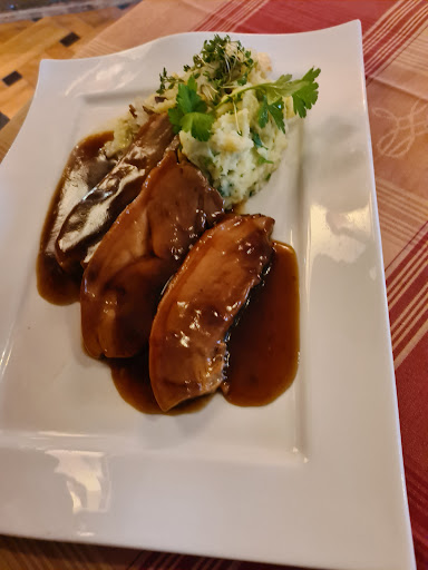 Ambiente, insbesondere innen, sehr schön. Wir haben zunächst sehr leckere und auch besondere Vorspeise und Hauptgericht gegessen. Das war wirklich schön. Danach wollten wir gerne einen Cappuccino und einen Espresso und ein Stück Torte (deshalb ja auch nur eine kleine Vorspeise). Schon auf Espresso und Cappuccino mussten wir länger als anderswo üblich warten, und sie wurden getrennt mit größerem zeitl. Abstand serviert. Die Torte kam auch nach 45 Minuten nicht, trotz 2maligem freundlichen Nachfragen und dem Hinweis, dass der Cappuccino bereits kalt sei, nicht. Also ein drittes Mal nachgefragt mit zugegebener Maßen etwas mehr Nachdruck und der Bitte dann auch gleich die Rechnung mitzubringen. Darauf folgte eine lautstarke lange Tirade der Bedienung, beginnend mit 'dann sollten wir halt nach Mac Donalds gehen, wegen dem Druck wolle niemand in der Gastro arbeiten'... Sie hörte überhaupt nicht mehr auf! Auch das Paar am Nachbartisch gab uns Recht. Wie kann man nur Gäste so beleidigen! Die Rechnung kam dann schnell, mit dem Hinweis die Torte sei storniert. Ich verstand das zunächst so, dass sie die nun als Entschuldigung kostenlos bringen würde. Nein! Bringt sie nicht mehr! Also ein Rauswurf!!! Es brachte dann auch nichts, dass die Kollegin versprach, wenn wir in 1 1/2 Std. wieder kämen bekäme ich Torte und Cappuccino kostenlos. Nein Danke! Abgesehen davon dass unser Ausflug hier bereits zu Ende war, mir war der Appetit gründlich vergangen bei dem Versuch uns bei den anderen Gästen im Restaurant bloßzustellen. Es tut mir wirklich leid das so schreiben zu müssen, es begann so schön. Aber so geht das gar nicht! Auch nicht mit dem Hinweis, das halt viel los sei. Ein Stück Torte in 45 Min. nicht zu servieren, dann beleidigen und rauswerfen....