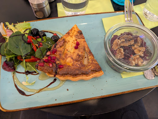 Auf der Karte gibt es viele tolle vegetarische Varianten von Burger mit Linsen, Soja oder Gemüse Patty bis hin zum vegetarischen Sandwich. Wir hatten den Burger mit Gemüse Patty und Pommes sowie eine Ziegen-Birnen Quiche mit Rote Beete Salat (war extra) bestellt und waren vom Geschmack sehr überzeugt. Es wurde alles frisch hergestellt, hat entsprechend etwas gedauert und war schön auf dem Teller serviert worden. Auch beim Nachbartisch sah das Essen super aus.