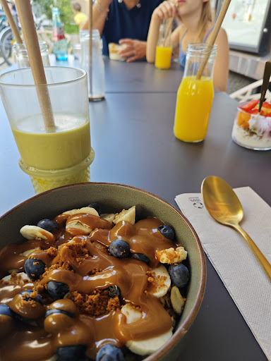 Beim Essen hatten wir Granola Lotus mit Naturjoghurt und Früchten – das war in Ordnung. Nur bei meiner Tochter, die Granola ohne Lotus bestellt hatte, war es enttäuschend: ungesüßt, Früchte eher sauer, kein Honig oder etwas, das es ausbalanciert hätte. Insgesamt war es für den Preis nicht überzeugend. Die anderen Speisen sahen zwar lecker aus, aber probiert haben wir nichts weiter. Leider machten die vielen Wespen draußen das Ganze auch wenig angenehm.