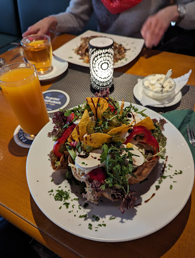 Terrible service! We waited 40 minutes for some artificial 'nachos' with guacamole dip. They were basically Doritos out of a plastic bag. Before even having time to finish the nachos, the very unfriendly waiter brought our main course, almost throwing my plate on the table in front of me and not even having the decency to apologize for the eternal wait, not even a 'Guten Appetit'. The salmon was OK but the burnt grilled vegetables were tasteless! In the end, we also had to ask for the bill a couple of times which took about 20 minutes and the unfriendly waiter did not even say thank you or bye, just walked away after we paid. Don't waste your time or money at this place. I've never had such bad service in a 'restaurant' in...