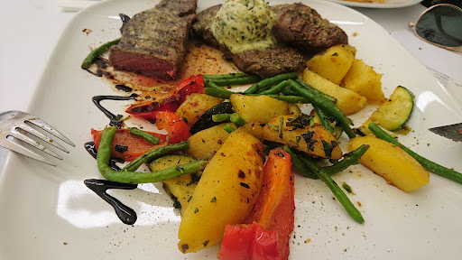 Read moreGriechisches Restaurant im Zentrum von Bad Nauheim. Netter Inhaber. Das Restaurant ist leider etwas in die Jahre gekommen. Wird auch im Biergarten deutlich, der nicht sehr einladend und gemütlich rüberkommt. Steaks gibt es auch auf der Karte aber der gemischte Steakteller hat mich nicht wirklich überzeugt. Wenn man schon nicht gefragt wird wie man sein Steak haben will, ist i.d.R. was im Busch. Das Fleisch war dann auch well done und teilweise sogar etwas drüber also etwas trocken. Da Tomahawk und Rip-Eye auch auf der Karte stehen, sollte man hier etwas mehr erwarten dürfen. Die Bratkartoffeln sind übrigens kleine komplette Kartoffeln, die angebraten werden und mit verschiedenen Gemüse serviert werden. Mit Bratkartoffeln, wie man sie typischerweise in Deutschland macht, haben sie nichts zu tun. Dies nur als wertfreier Hinweis. Man ist ja schließlich beim "Griechen" und nicht in einem Lokal mit dt. Küche. Der Salat mit überbacken Ziegenkäse ist gut angekommen. Das frische Pita-Brot zu dem Tzatziki war auch lecker. Der Beilagensalat bestand zwar "nur" aus grünem Blattsalat und etwas Krautsalat. War aber alles schön frisch und ein gutes Balsamico Dressing. Das hat geschmeckt. Eine warme Vorspeisenplatte hatten wir auch noch. Die war ganz ok. Etwas "Sosse" o.ä. hätte den ganzen frittierten Speisen aber gut getan. Gut fanden wir auch, dass man hier auch Mittags (war Samstag) bis 14.30 Uhr noch etwas bekommt. Viele Lokale haben den Mittagstisch ja inzwischen komplett eingestellt. Fazit: Da wir jetzt wenig typisch griechische Speisen hatten, können wir es nicht vollumfänglich bewerten. Das Essen war teilweise gut und teilweise sagen wir mal ok. Wer vom Interieur viel Wert auf ein schickes trendiges Lokal legt, ist hier eher nicht...