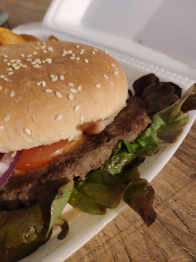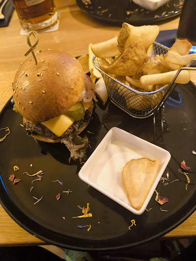 Read moreDas Lokal hat ein nettes Ambiente. Innen sieht es richtig schön aus. Wir waren leider an einem Regentag da, somit hätten wir keine Möglichkeit draußen zu sitzen, da die Terrasse auch unter der Überdachung nass war. Die Klos sind im Keller, über eine Treppe zu erreichen. Dort ist der schöne Eindruck vorbei. In der Damentoilette würde wohl schon länger nicht aufgeräumt, es lagen in der einen Kabine vier leere Klopapierrollen. In die andere habe ich nicht geschaut, da ich bei den Lichtverhältnissen eh nicht viel zu sehen gehabt hätte. Weil die Kabinen sind sehr sehr dunkel und man konnte nicht mal schauen ob das Klo sauber ist. Die Bedingungen waren leider sehr sehr langsam, wir bekamen die Karte und dann lief ganz viel Zeit davon, bis wir unsere Getränke bestellen konnten. Finde ich immer etwas blöd, geparkt und dann nicht abgeholt! Nach der Getränkebestellung dauert es ziemlich lange, bis diese dann auch am Tisch waren. Auf das Essen haben wir mindestens 45 Minuten gewartet. Dann kamen sehr kleine Burger und Kartoffeln Chips an. Diese waren nur lau warm, was ich so nicht erwartet hatte- bei der langen Wartezeit. Die Preise finde ich für den kleinen Burger zu hoch. Zumal die Beilagen noch extra kosten. Also noch einmal muss ich dort nicht mehr zum Essen gehen, weil es einfach nicht stimmig war- schlechte Organisation des Personals und die zu...
