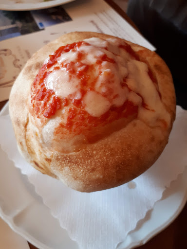 Wir wollten dann auch sehr schnell diese ungemütliche Lokalität verlassen, doch wie gesagt, es kam ja keiner. Als dann endliche eine Dame kam haben wir, auf Ihre Frage, wie es denn war, die Wahrheit gesagt. Ihre Reaktion: Ja so sind die Pizzen aus Kalabrien halt! Wir haben mal gegoogelt, also sooo eine Pizza wie dort findet man nirgends im Netz. Zur Erklärung, Die Größe der Pizza ist in etwa normal. Der ganze äußere Rand (sehr breit!) ist gänzlich leer. Dann kommt ein Teil auf dem nur Tomatensoße ist und erst dann der eigentliche Belag. Also der Belag ist ca. nur die Hälfte der Pizza. Allerdings die innerer Hälfte, bedeutet. Es ist nur ein Bruchteil der Pizza überhaupt belegt (das Innere des Kreises hat ja bekanntlich eine wesentlich geringere Fläche wie das Äußere). Dafür sind die Preise aber...