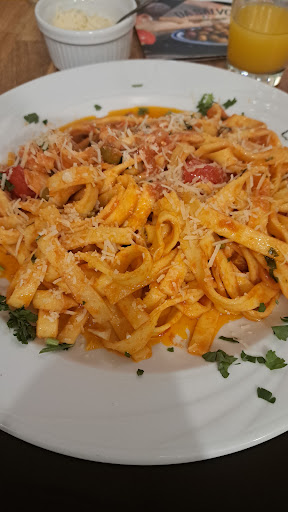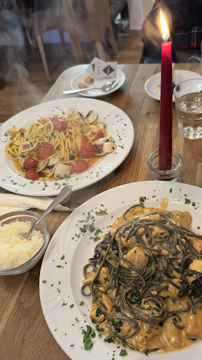 Read moreWaren mit der Mädelsrunde da. Kante das Restaurant nicht, aber eine Freundin hatte so geschwärmt. Ich war leider enttäuscht... Tageskarte war eine komplett eng beschriebene aufgestellte Tafel. Alle renkten sich den Hals aus diese Tafel komplett zu lesen. Hatte mich für das Iberico Filet mit Masala Sauce entschieden. Die Beilage konnte man sich dazu aussuchen. Habe mich letztendlich für Gemüse entschieden, nachdem ich die Hälfte der Aufzählung gar nicht verstanden hatte, weil es so schrecklich laut war. Das Iberico Filet entpuppte sich dann als zwei panierte Schnitzel die fettgetränkt waren und das Gemüse bedeckte eine kleine Ecke des großen Tellers. 23,50€...hätte ich keine Vorspeise gehabt, wäre ich nicht satt geworden. Denn gedacht...komm denn gibt's bestimmt noch wenigstens lecker Nachtisch..klassisch Tiramisu... Das kam denn fertig, aus einer Packung abgeschnittenen, auf den Teller. Durch die offene Küche war dies gut sichtbar, also da konnte auch wirklich der schräge Gesang des Inhabers, nichts mehr...