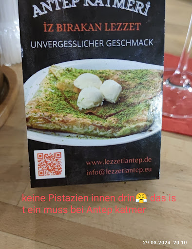 Wir fragen nach Nachtisch. Katmer ist eine Spezialität aus der Gegend Gaziantep und hat innen und außen Pistazien. Hier ist dies anscheinend nicht der Fall, da Pistazien zu teuer sind, wird uns gesagt. Sollte dann vielleicht nicht als Solches geworben werden!