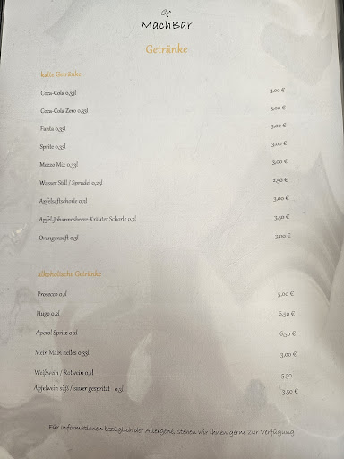Read moreMein Lieblingscafé war geschlossen und fand ich ein Plätzchen im MachBar. Vor den Wespen floh ich in den Innenraum - erfolgreich. Der Apfelkuchen war sehr lecker, ebenso der Cappuccino. Die Bedienung war sehr freundlich — zu allen Gästen und Altersgruppen— eine sehr engagierte Frau. Und ihr Freundlichkeit kam von Herzen. Wahrscheinlich werde ich bei manchem Besuch auch im MachBar einkehren. Da ich nichts Deftiges aß, kann ich darüber auch nichts sagen. Auf jeden Fall...