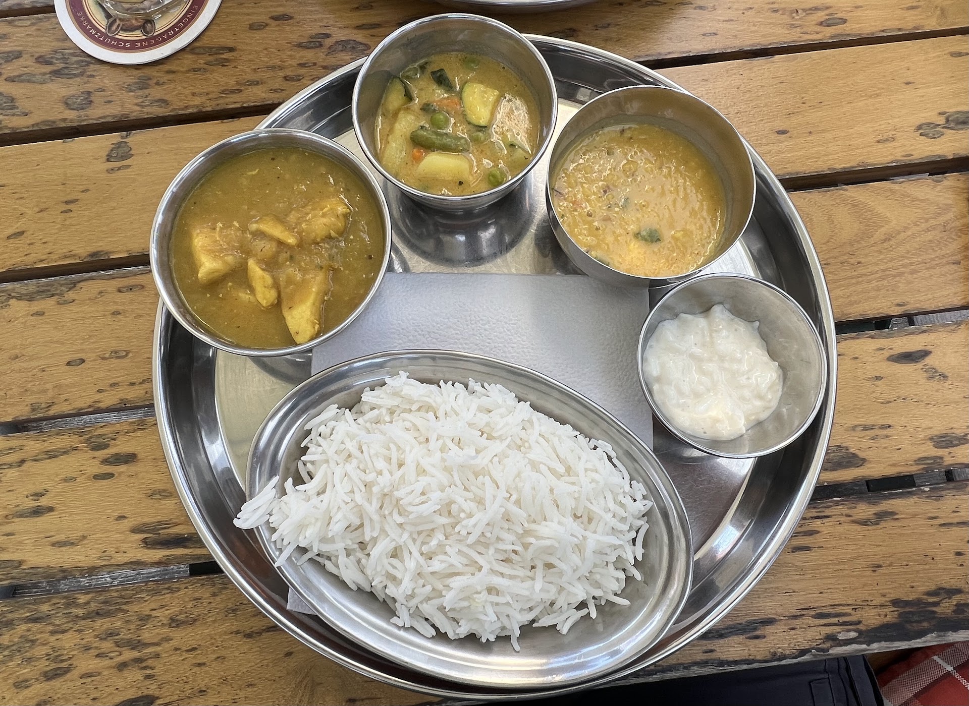 Als Getränk hatte ich mir einen Himalaya-Lassi mit Himalayasalz, der wirklich sehr gut geschmeckt hat, da neben dem Salz noch ein wenig Pfeffer und eine Prise gemahlener Kardamom hinzugefügt wurde. Hätte ich nur diesen Lassi bestellt, hätte ich nur dafür volle 5 Sterne vergeben. Die Punktabzüge gab es für das Essen, das wie auf dem Bild zu sehen genau so für jede Person serviert wurde.